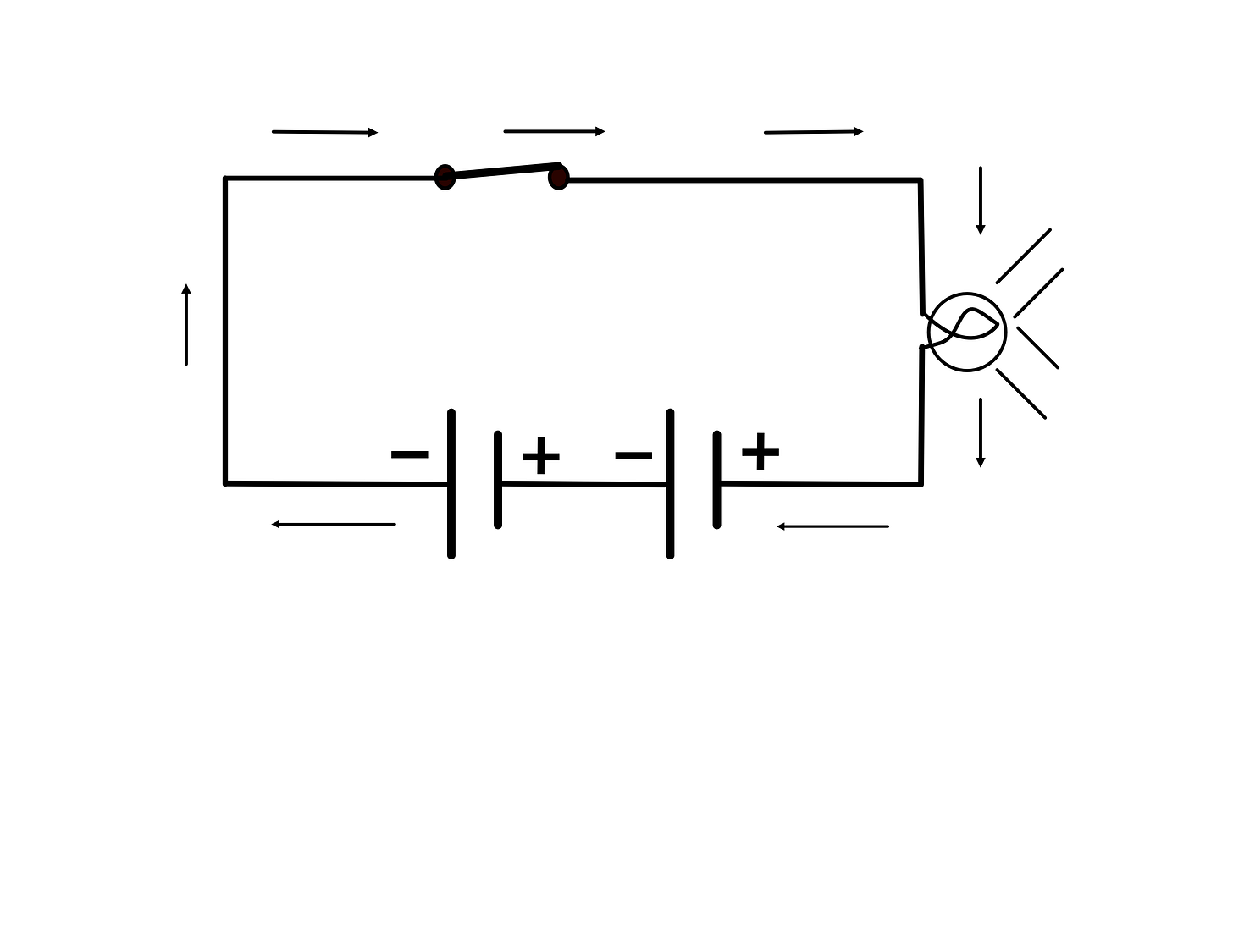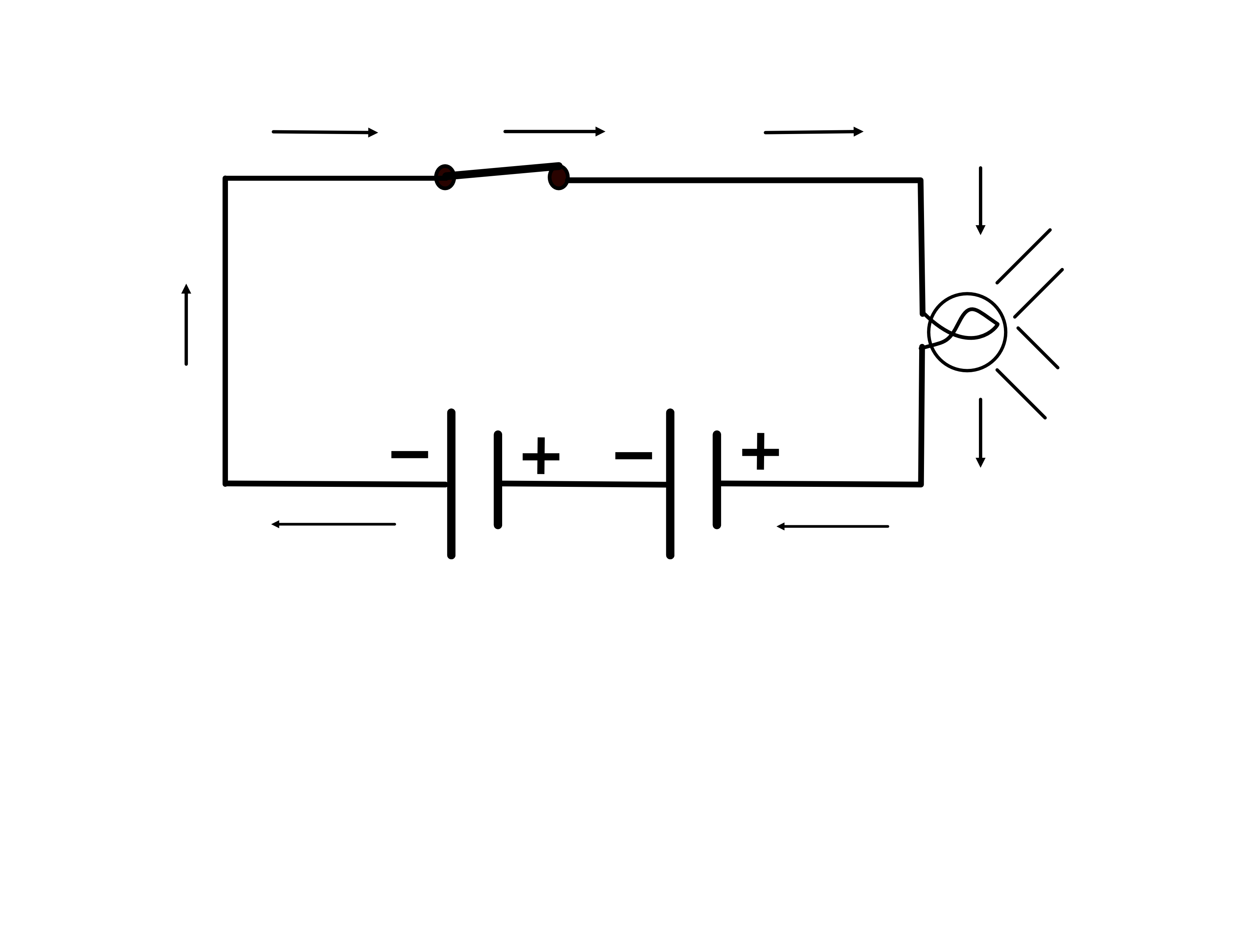 Starting with the negative side of the left battery, current flows through the conductors, through the switch, through the lamp and back to the posistive side of the batteries.